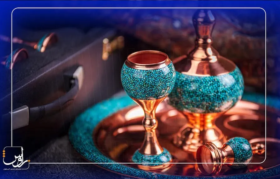 فیروزه کوبی:ظروف و تابلوهای فیروزه کوبی با سنگ فیروزه و طرحهای ظریف، باعث ایجاد فضایی سنتی و لوکس در اتاق پذیرایی میشوند.