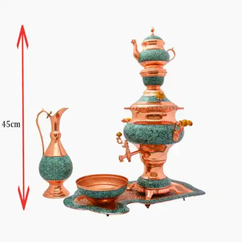 سرویس سماور فیروزه کوبی محصولی زیبا و چشم نواز تولید شده در صنایع دستی زاوش