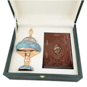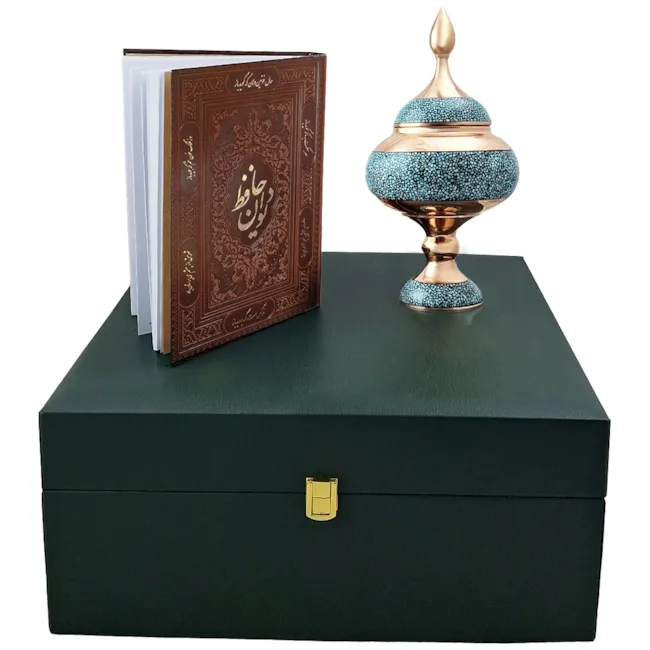 پک هدیه شکلات خوری بیشین فیروزه و دیوان حافظ با جعبه چرم